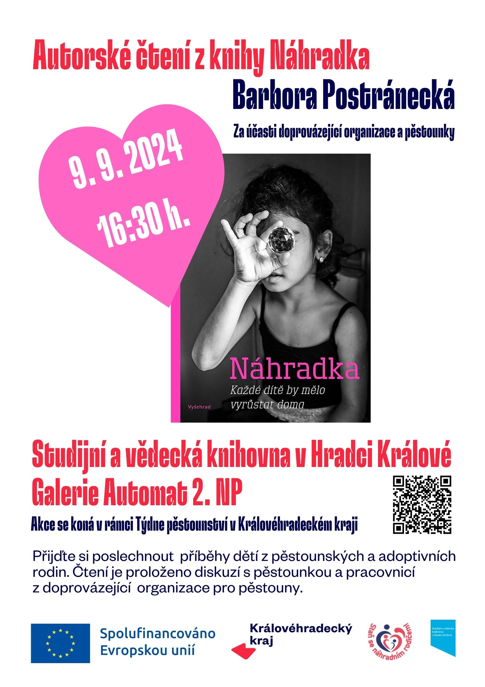 9.9.2024 se bude konat autorské čtení z knížky "Náhradka" za účasti pěstounky a doprovázející organizace.