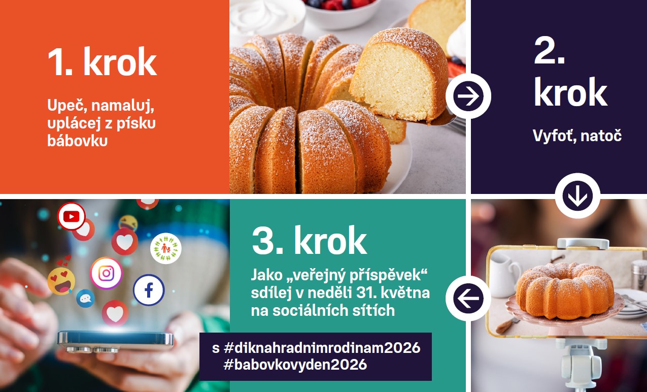 - Všechno to vyfoťte nebo natočte a dne 31. 5. nezapomeňte sdílet na sociálních sítích s hashtagem #diknahradnimrodinam2026 a #babovkovyden2026.